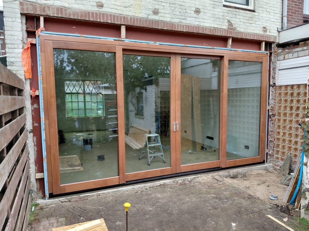 Oude deuren en kozijn compleet verwijdert. Hiervoor in de plaats een nieuwe schuifpui met dubbel gelaagd glas geplaatst voorzien van een blindschild aan de buitenkant. Binnen alles netjes afgetimmerd en opgeruimd.